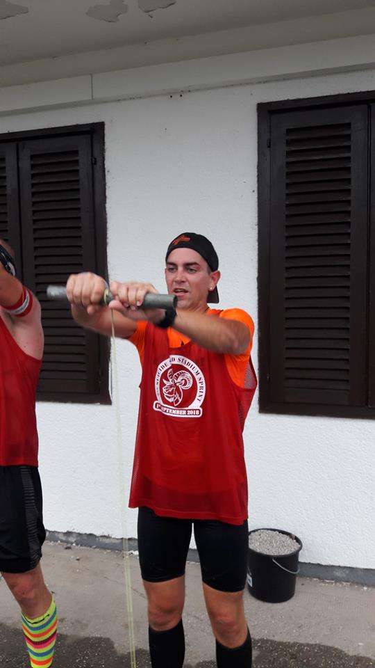 Im Anschluss ging es sofort zu einer kleinen Runde Sandbag Carry, nach welchem Kübel hochdrehen am Programm stand. An einem Kübel mit etwas Kies war ein Seil mit einer Spule befestigt. Der Kübel musste, die Spule mit den Händen nach vor gestreckt haltend, hochgekurbelt werden, ein sehr witziges Hindernis. Gleich danach war der Tire Flip (2x) und dann kam der „Holzplatten-Lauf“. Eine Holzplatte mit 4 Rollen, wahrscheinlich um einen Blumentopf o.ä. draufzustellen, musste eine kleine Runde mit den Händen geschoben werden. Sprich, man ist in Yoga-Position („Herabschauender Hund“ sagt Google^^) einmal eine abgesteckte Runde marschiert.