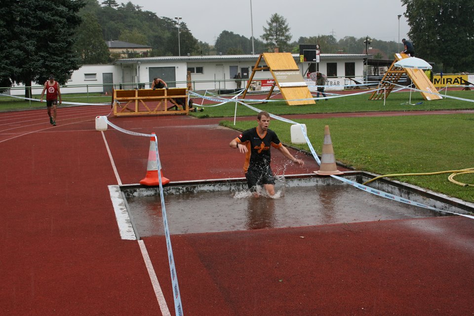 Danach ging‘s rein in einen Wassercontainer, um anschließend die Hindernisse im Stadion in Angriff zu nehmen. Zuerst eine kleine Holzmauer überwinden, danach sich durch ein Reifenhindernis durchquetschen und ab über eine kleine Holzschrägwand und durch eine Wassergrube zur Slippery Wall und der Inverted Wall. Schnell noch die Anhöhe rauf und über Stiegen wieder runter, über eine 2m Wall und ab ins Ziel. Äh, doch nicht, die Stadionrunde musste nochmal bewältigt werden. Also zurück zur kleinen Holzmauer und repeat.