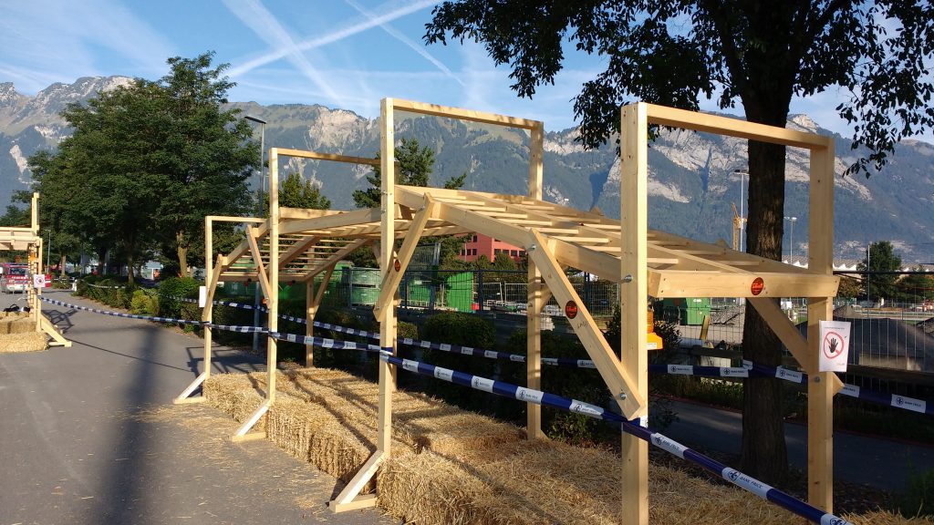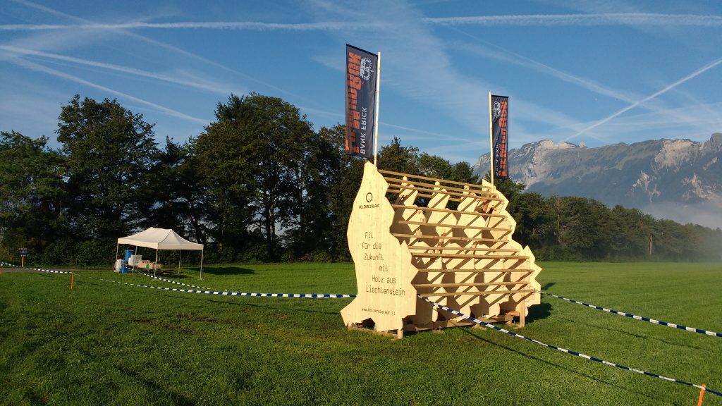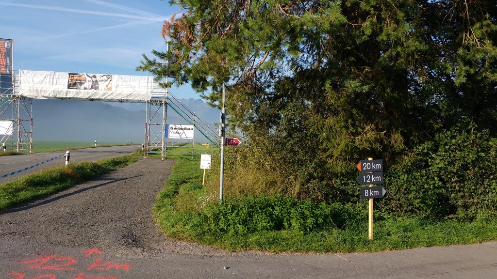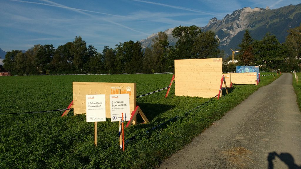 Nach wenigen Radlminuten war die Staatsgrenze am nächsten Morgen erreicht und ich strampelte auf einem großzügigen Radweg nach Ruggell. Dampfige Wiesen säumten den Weg und plötzlich tauchten die ersten Hindernisse auf. Ein Kletterhindernis in Form des Landesumrisses von Lichtenstein, eine Straßenüberführung, ein paar Wände usw zeigten eindeutig, dass der LIeMudRun hier zu Hause ist. Auf der Homepage wurde für Teilnehmer die per Fahrrad anreisten ein eigener Radparkplatz ausgeschrieben und eine kleine Erfrischung versprochen. Also steuerte ich auf den Radplatz zu und wurde freundlich mitsamt einem Eistee empfangen.