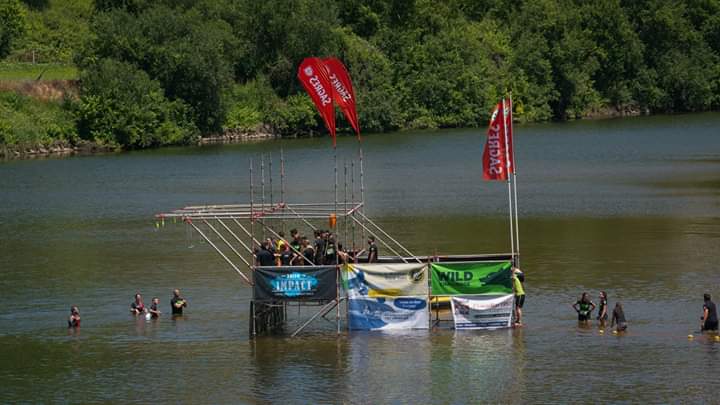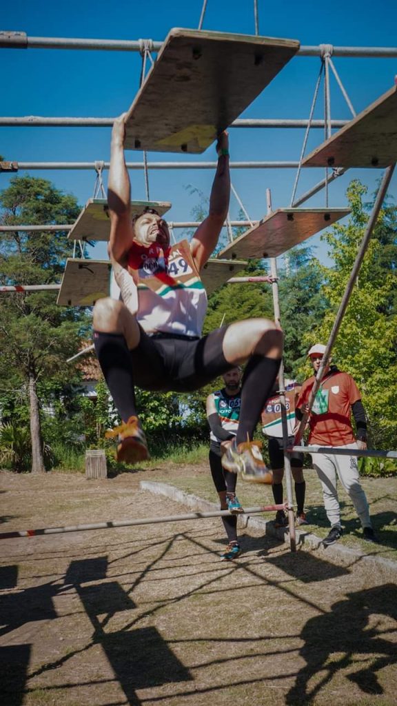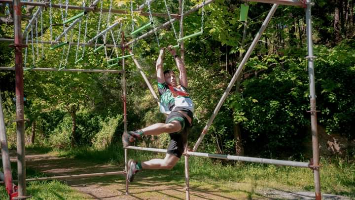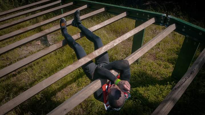 Nach einer 2m Holzwand ging es endlich bergab und ein kurzer Blick auf die Uhr verriet, dass nur mehr 4KM (von 10) zu absolvieren waren. Natürlich gab es am Weg zwischenzeitlich wieder was auf die Arme (weitere 2 Rigs, Olè und Oje) bevor wir dann wieder am Flussufer gegenüber des Startgeländes einlangten. Eine Tire Flip Station später kam meine Lieblingskombo … Cargonet danach Ringe zum seitlich hangeln danach Flying Monkeybars. Ich mag den Flying Monkey seeeehr und die Freude über die schön weit gesetzten 3 Stangen ließ mich meine müden Schultern vergessen.