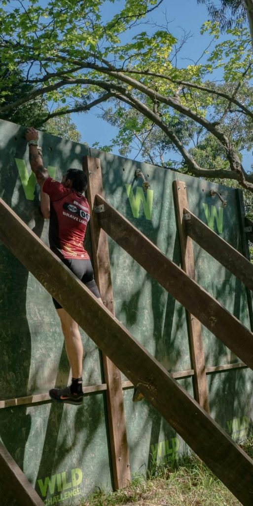 Am Weg nach oben wurde es dann schlagartig sehr anspruchsvoll. Von weitem hörte man wieder Jubel und „ohhhhhh’s“ hallen. In einer Kehre stand ein Rig mit Griffen abwechselnd aus faustgroßen Holzkugeln und Kegeln. Holla die Waldfeh das haute rein … aalglatt waren die Griffe. Ich probierte es 4x und gab dann WO. Christian schwang sich erfolgreich durch. Arme kurz ausgeschüttelt und weiter zu einer Inverted Wall. Schwupps und mühelos drüber. Kurz unter der Anhöhe verlief ein breiter Weg auf dem dicht an dicht die zu bewältigenden Aufgaben standen, welche Unterarme und Schultern zum „Weinen“ brachten.