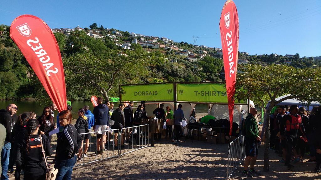 Blauer Himmel, Sonnenschein, ein glasklarer Fluss mit einem Sandstrand und zum Drüberstreuen eine einladende Beachbar mit kühlen Bieren vom Fass … die Lauflaune viel kurzfristig ins Bodenlose 🙂 Von dem „Schock“ erholten wir uns aber schnell wieder und spazierten erst einmal zur Registration. Den im Vorfeld per Mail übermittelten Informationen konnte man mit Hilfe von Google Translate (Englisch gibt es fast nix an Info) entnehmen, dass ein Haftungsausschluss unterzeichnet mitzubringen sei. Den hatten wir so natürlich dabei und nach kurzem Check der Daten wurden uns die Startnummern in die Hand gedrückt. Gleich im Zelt daneben gab‘s die Tshirts und das war es dann auch.